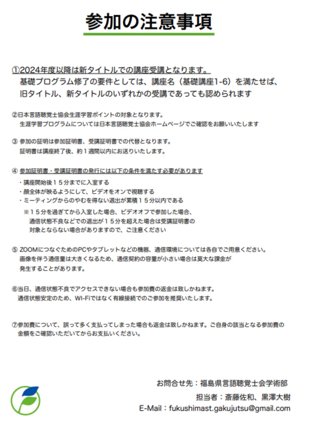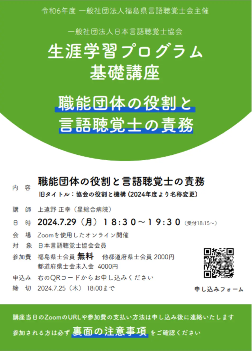 生涯学習プログラム基礎講座 職能団体の役割と言語聴覚士の責務 投稿日 2024-06-07 更新日 2026-03-26 著者 fukushima-st カテゴリー トピックス 生涯学習プログラム基礎講座 職能団体の役割と言語聴覚士の責務 基礎講座の案内PDFファイルはこちら この記事を書いた人 fukushima-st 記事一覧