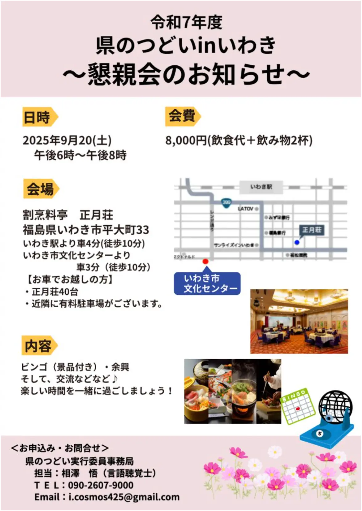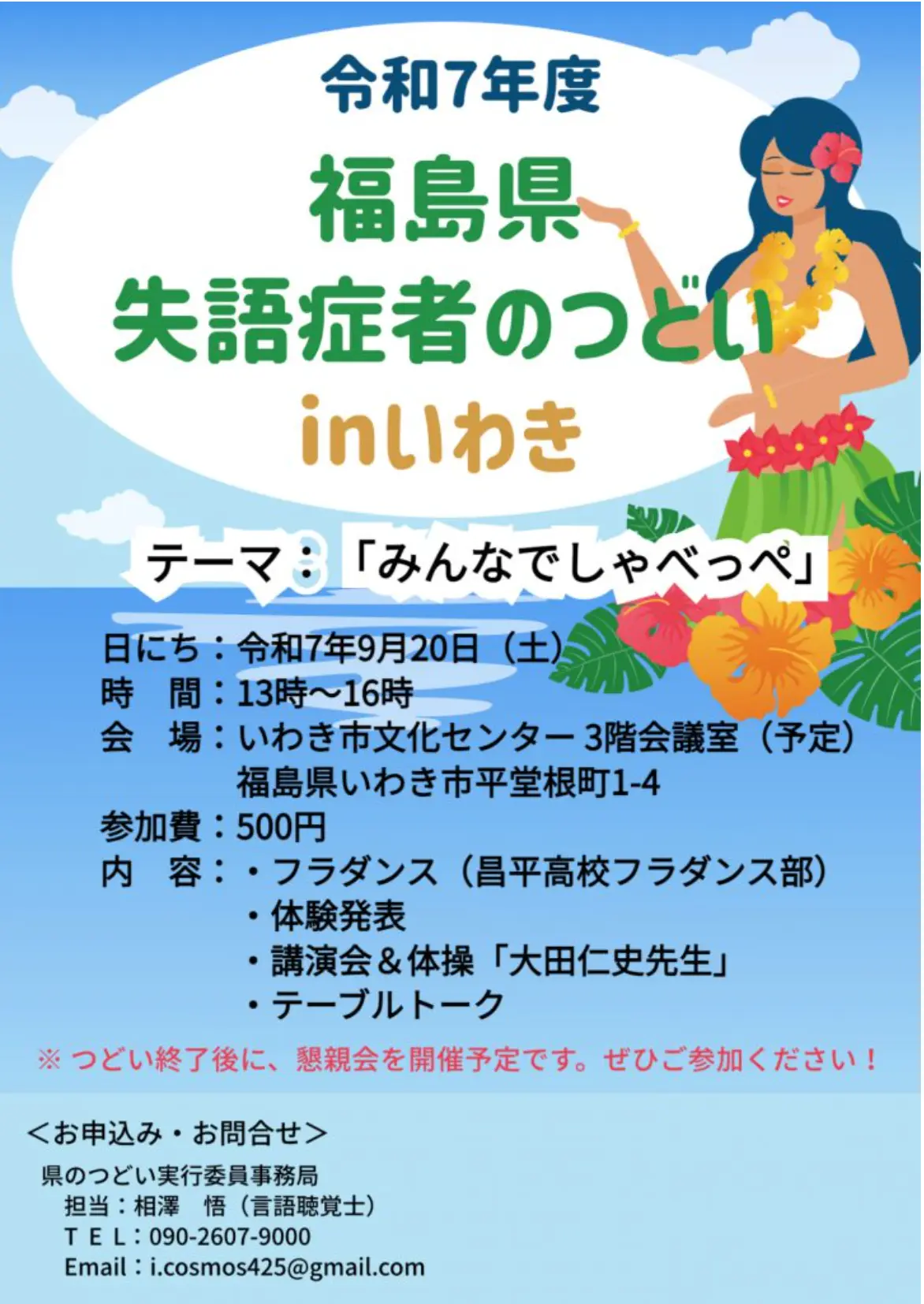 令和7年度福島県失語症者のつどいinいわき 投稿日 2025-08-20 更新日 2026-03-26 著者 fukushima-st カテゴリー トピックス カテゴリー 未分類 令和7年度福島県失語症者のつどいinいわき 申込みPDFファイルはこちら この記事を書いた人 fukushima-st 記事一覧