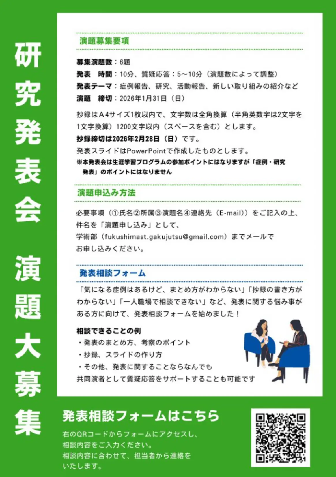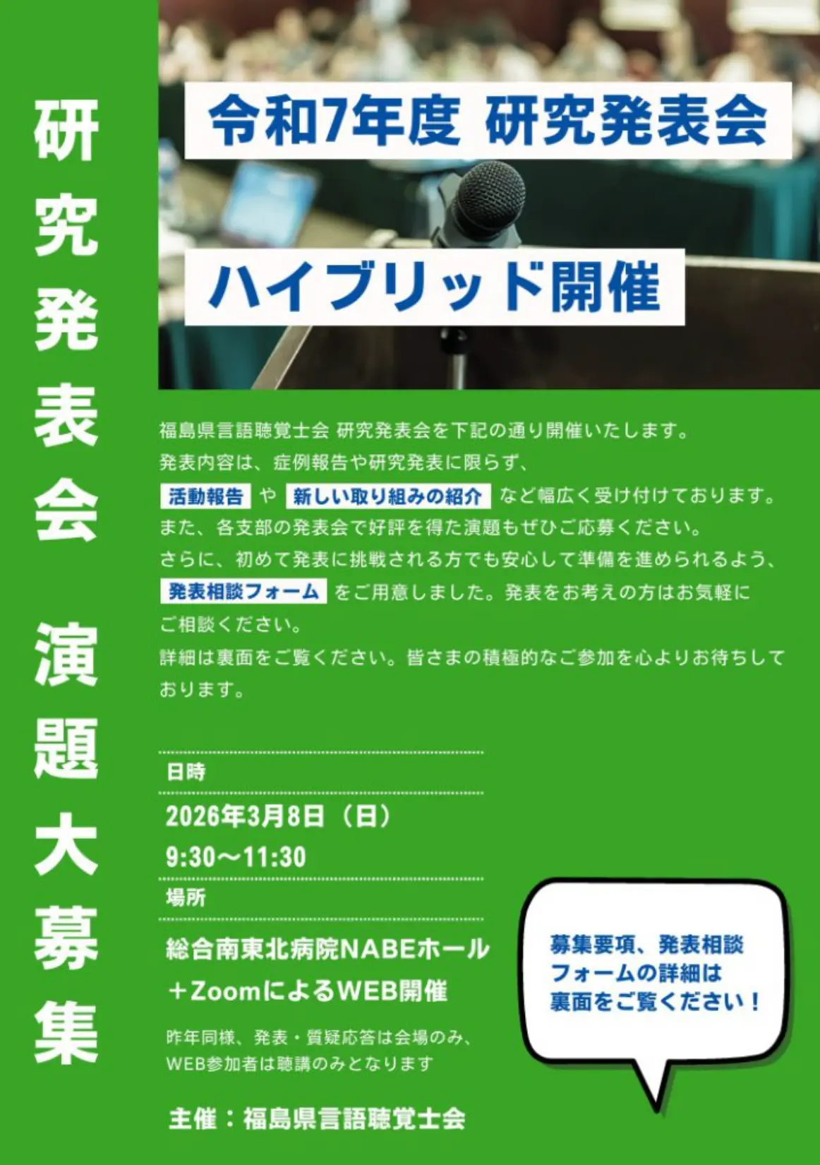 令和7年度福島県言語聴覚士会研究発表会 演題募集締切延長 投稿日 2026-02-05 更新日 2026-03-26 著者 fukushima-st カテゴリー トピックス 令和7年度福島県言語聴覚士会研究発表会 演題募集締切延長 研究発表会のPDFファイルはこちら この記事を書いた人 fukushima-st 記事一覧