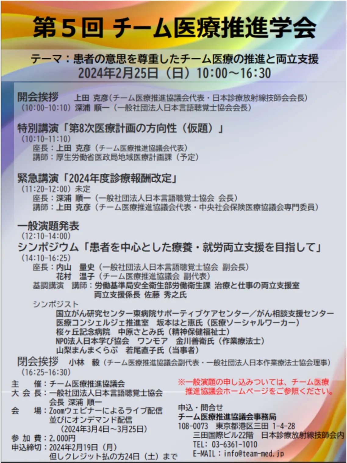 第5回チーム医療推進学会(2.25.[オンデマンド3.4.~3.25.]) 投稿日 2024-02-20 更新日 2026-03-26 著者 fukushima-st カテゴリー トピックス 第5回チーム医療推進学会(2.25.[オンデマンド3.4.~3.25.]) 第5回チーム医療推進学会の開催並びに参加事前登録について | チーム医療推進協議会第5回チーム医療推進学会抄録集をダウンロード 第5回チーム医療推進学会を下記の通り開催いたします。本年のテーマは「患者の意思を尊重したチーム医療の推進と両立支援…www.team-med.jp 第5回チーム医療推進学会 参加者募集の協力依頼[申し込みQRコード] 第5回チーム医療推進学会 ポスター この記事を書いた人 fukushima-st 記事一覧